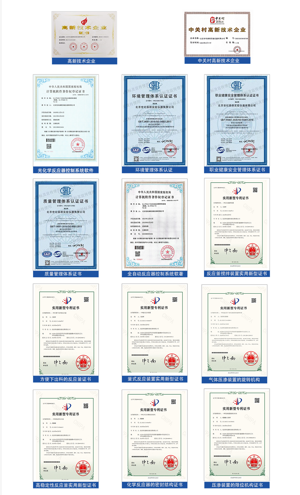 世紀森朗公司的反應設備整體質量保證體系已通過認證,符合ISO 9001:2015;且涵蓋了森朗產品的總體質量保證和管理合規性方面,而不是單個產品的認證。